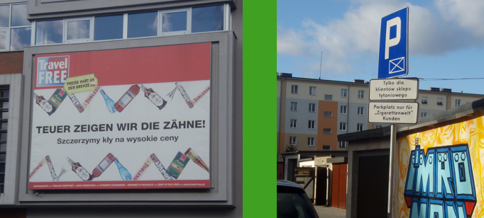 Zum erstenmal hatte ich Soldaten-Schuhe über einer Straßenlaterne am Tor der US Army in Babenhausen bei Darmstadt gesehen. Ich fand das damals witzig und kreativ an einem Ort, der für meine Generation der Kriegsdienstverweigerer nur mit Gewalt, Tod und Leid zu tun hatte. Das Farbdia habe ich oft als Protest der kleinen Möglichkeit gegen die große Macht des Militärs gezeigt. Es dauerte Jahrzehnte, bis ich erfahren habe, was es bedeutet, wenn Schuhe quasi auf dem Weg in das Blaue des Firmaments sind. Im Frühsommer fuhren wir Berliner nach Frankfurt an der Oder und gingen über die Brücke in unser Nachbarland Polen, was seit EU-Zeiten normal ist, davor ohne Visum, Geldzwangsumtausch und strenge Grenzkontrollen eine unvorstellbare Aktion war. Heute locken unsere Nachbarn die kaufkräftige deutsche Kundschaft auf vielfältige Weise: