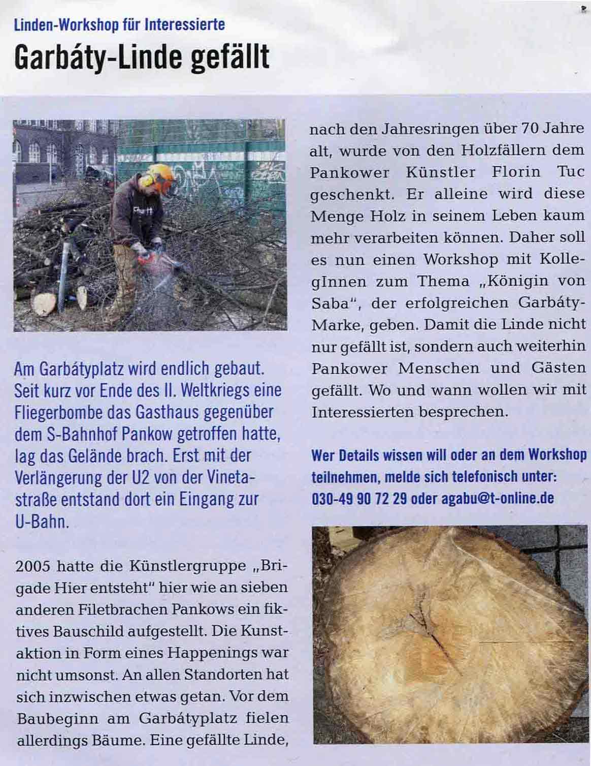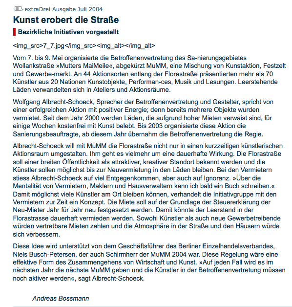 Nach 2004 organisiert die Betroffenenvertretung des Sanierungsgebiets Wollankstraße zum zweiten Mal ein Kunstfest in der Florastraße. Im Rahmen der »Refugien 9« wird am 13. Mai von 14 bis 20 Uhr das Projekt Kunst statt Leerstand rund um die Florastraße präsentiert. Die Vernissage ist bereits am 12. Mai, 19 Uhr in den Räumen der BetroffenenVertretung in der Florastraße 74. »Wir wollen mit dieser Aktion an die Erfolge der KunstMeile 2004 und des Festes »Trommeln für Pankow« anknüpfen«, erklärt der Beauftragte für Kultur und Medien der BV, Wolfgang K. Albrecht-Schoeck. Mehr als 70 Künstlerinnen und Künstler aus 21 Nationen belebten vor zwei Jahren das von Ladenleerstand geprägte Quartier nachhaltig. Auch in diesem Jahr werden wieder interessierte Vermieter und Nutzer gesucht.