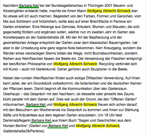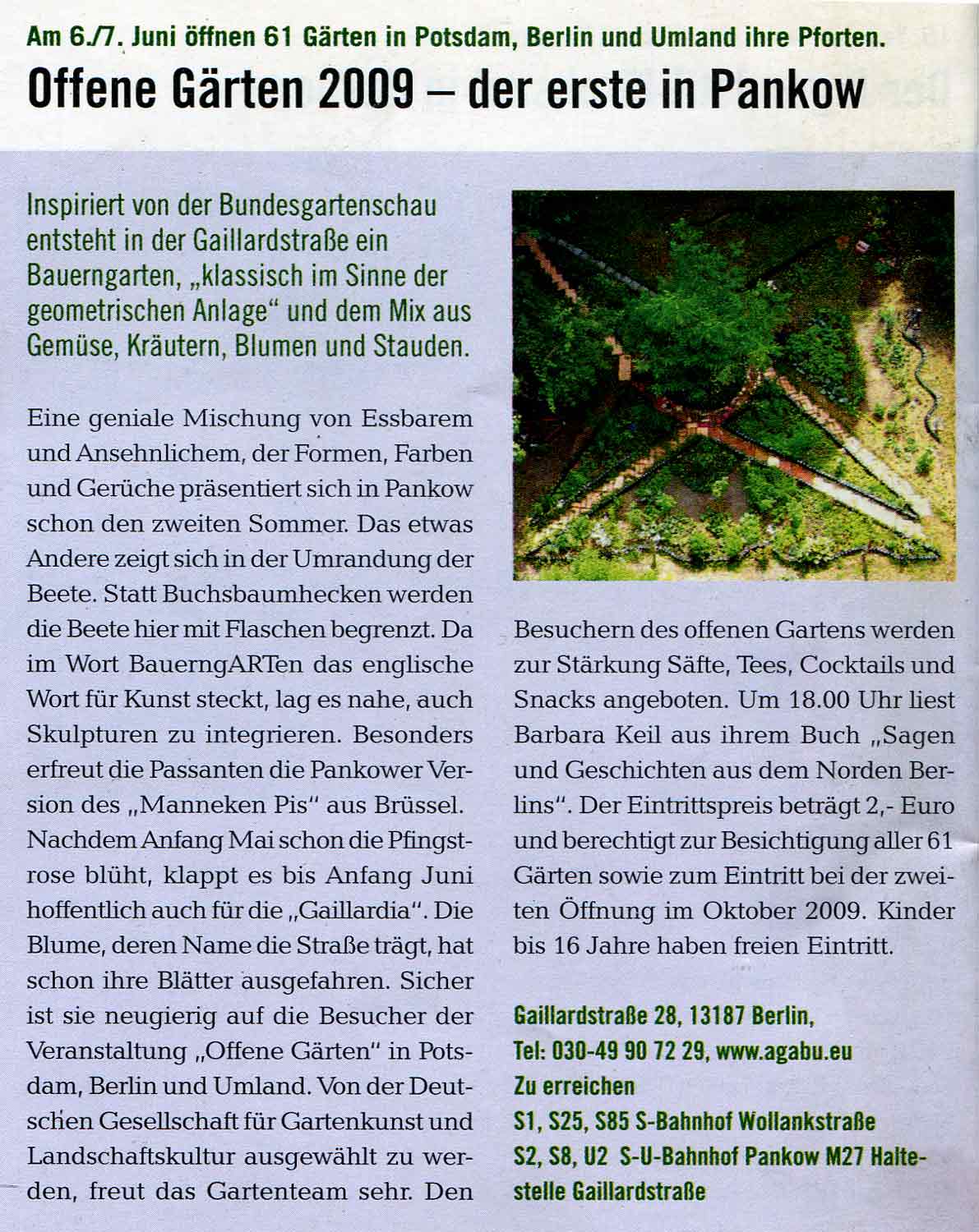 a.g.a.b.u.? a.g.a.b.u.! Unter dem Motto „alles ganz anders bei uns!“ hat das Künstlerpaar Barbara Keil und Wolfgang Albrecht-Schoeck in Pankow auf einer Brachfläche ein ganz besonderes Gartenparadies geschaffen. Statt klassischer Wegbegrenzung fassen alte Flaschen die sternförmig angelegten Beete ein. Recycling und Natur gehen so eine spannende Verbindung ein. Und weil im Wort Bauerngarten „ART“ steckt, findet man hier zwischen Gemüse, Blumen und Kräutern auch verschiedene Skulpturen. Haben Sie Lust auf dieses spannende Ensemble aus Kunst und Natur bekommen? Der BauerngARTen Pankow lädt Sie zu einem Rundgang ein.