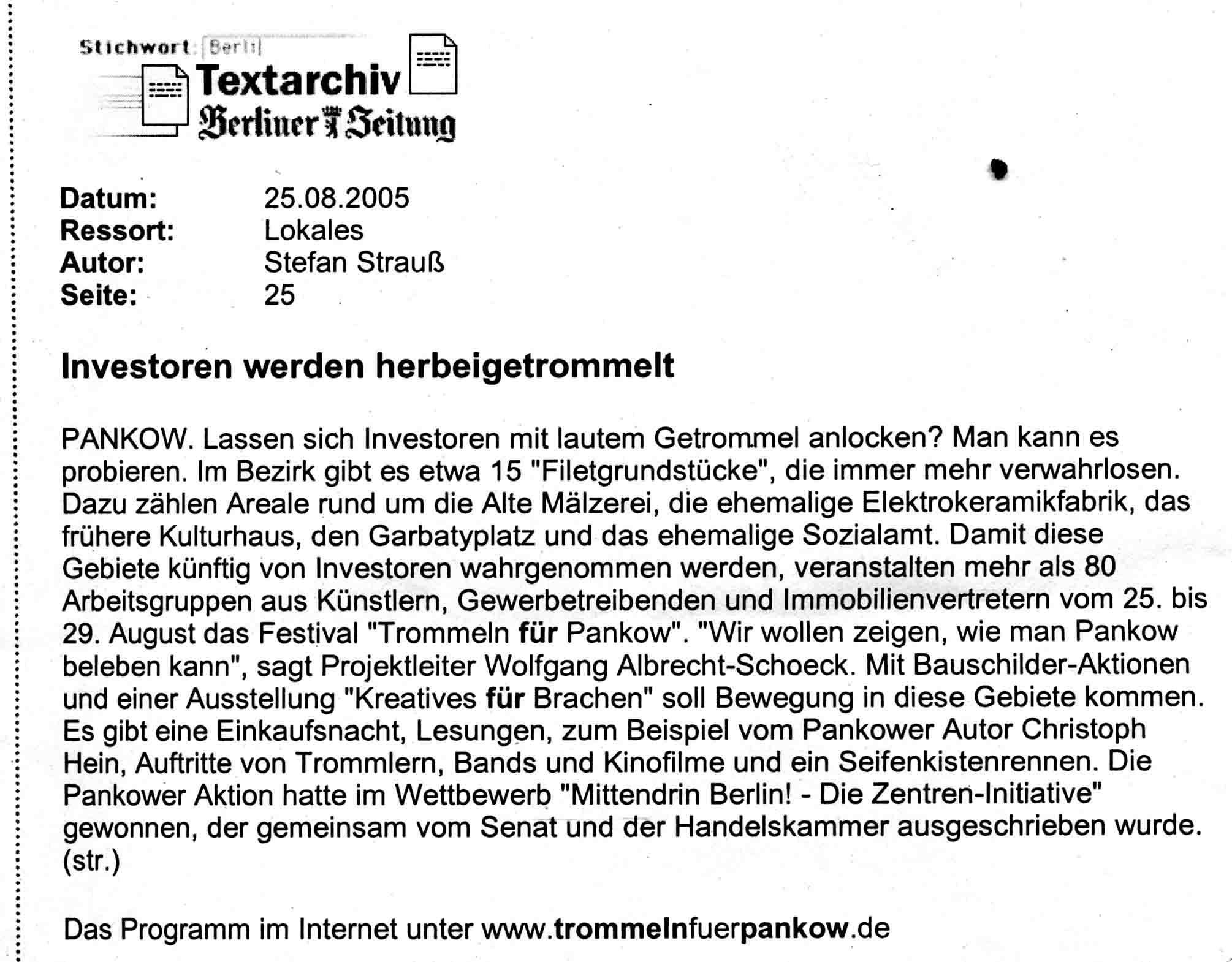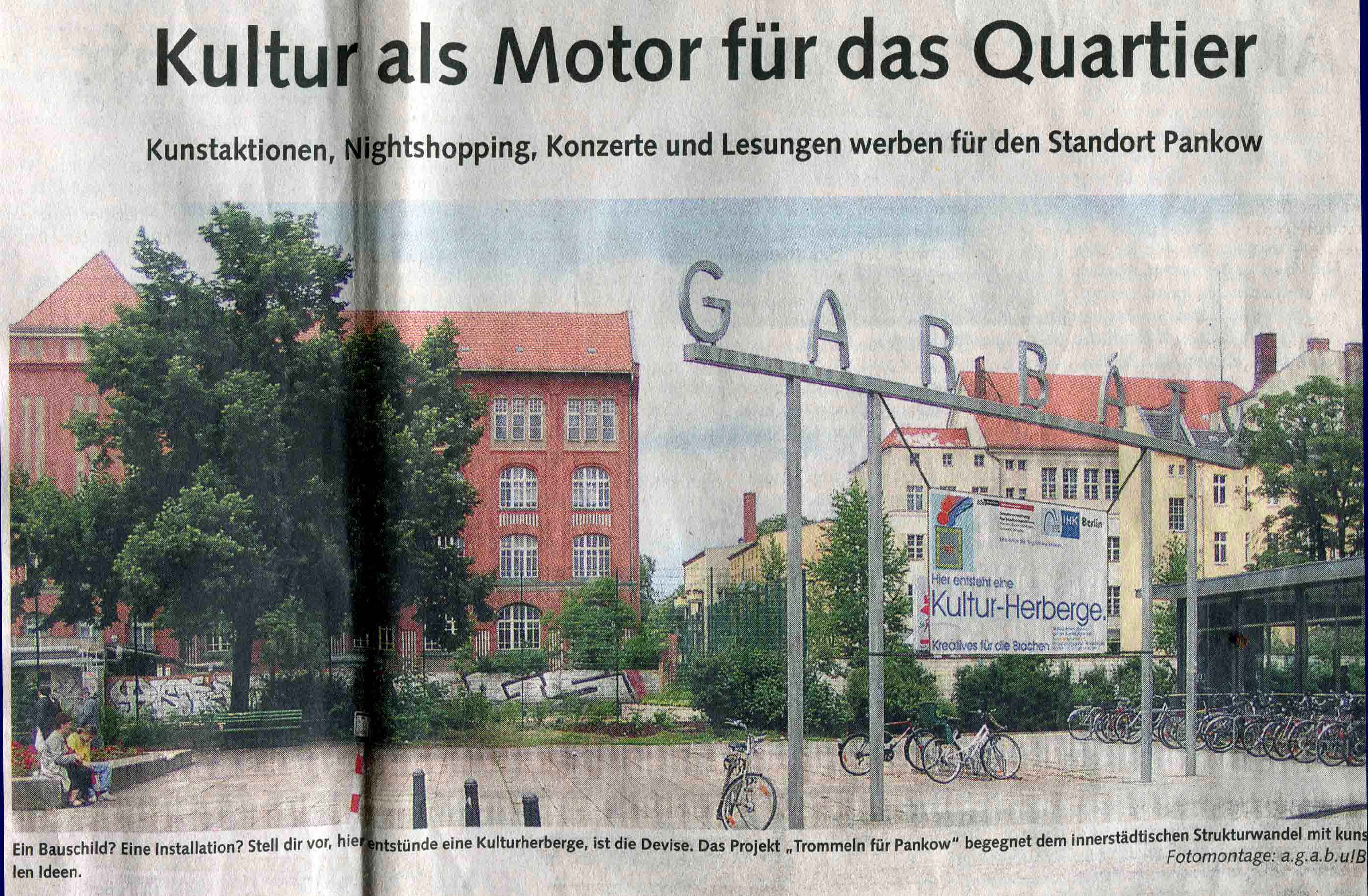 Das Carrée „Alt-Pankow mit dem Anger Breite Straße, der nördlichen Berliner Straße, Flora- und Wollankstraße liegt in einem Sanierungsgebiet. Es hat sowohl städtebauliche Defizite, Brachflächen in bester Lage, als auch eine Handelsstruktur, die entwicklungsbedürftig ist. Viele Pankower bedauern das Fehlen eines Kaufhauses. Hinzu kommt der Leerstand von Läden auch an Hauptverkehrsstraßen. Die Florastraße hieß vor ihrer Bebauung „Communikationsweg“, weil sie die Berliner mit der Wollankstraße verband. Deshalb wählt „Trommeln für Pankow“ Communikation als roten Faden, als zentralen Begriff. Communikation ist Unterhaltung, auch Diskurs, Schreiben, Writting / Street Art; Mail Art, Austausch, Tauschhandel, auch Botschaften, bis zur Sprache der Blumen, alle Formen der Kunst sowie Musik und Tanz. Das Mittel für den Zweck: „Trommeln für Pankow“.