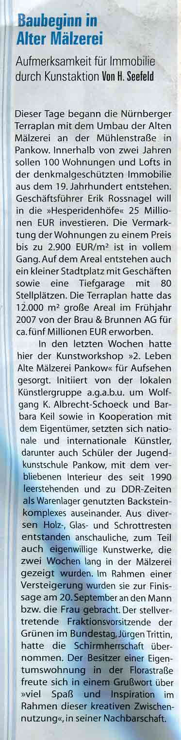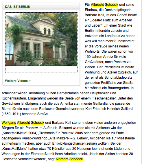Pankower Maler, Grafiker als Galerie-Besetzer im Sanierungsgebiet Wollankstraße 1 Wolfgang K. Albrecht-Schoeck, Heidi Vogel 2 Ilse-Maria Feltz, Werner Müller, Irina Schütze-Schulz 3 Tina Mirtschin, Martin Enderlein, Manfred Butzmann, Ursula Strozynski 4 Petra Wende, Matthias Kaiser, Katharina Kaiser 5 Thomas Kerwitz 6 Chris Kremberg, Holger Friedrich, Benjamin Kerwin, Brigitta Hase 7 Sigfried Knittel 8 Karin Sakrowski 9 Cosima Tribukeit, Oliver Preiß, Christoph Meyer, Sascha Herrmann, Niels Kinder 10 Anne und Max Rosin, Ellen Kobe, Stefan Ohnesorge 11 Sybille Hahn, Antje Gratzik 12 Angel Montes, Oscar Castillo 13 Sabine-Charlotte Bieligk, Stefan Fuchs, Dietlind Paul, Christiane Liedtke